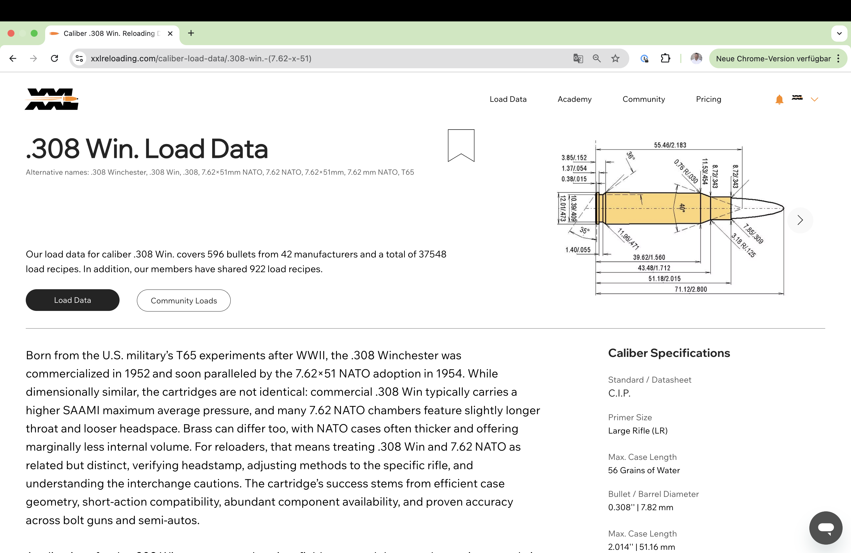 - Kaliberbeschreibung mit Geschichte, Hauptanwendung, Wiederladeempfehlungen usw.