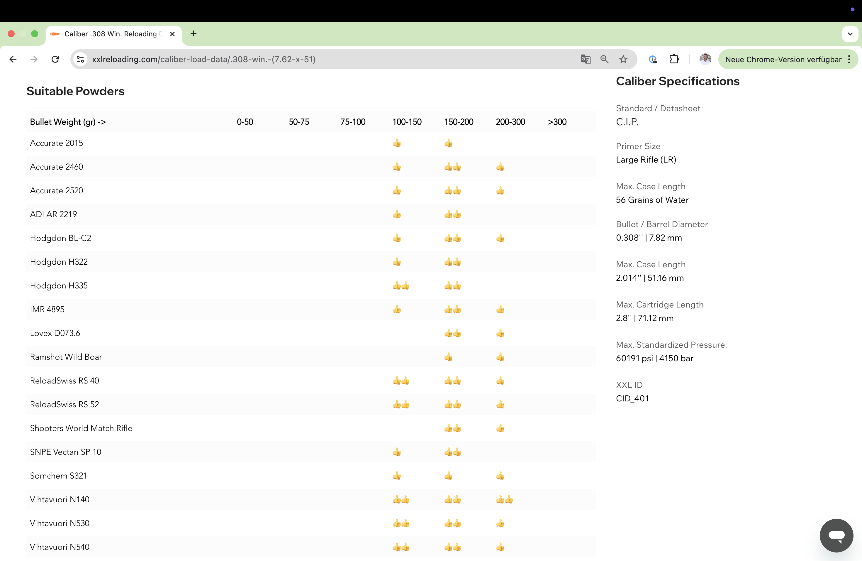 - Geeignete Pulver und Pulver, die innerhalb unserer Community für dieses Kaliber beliebt sind